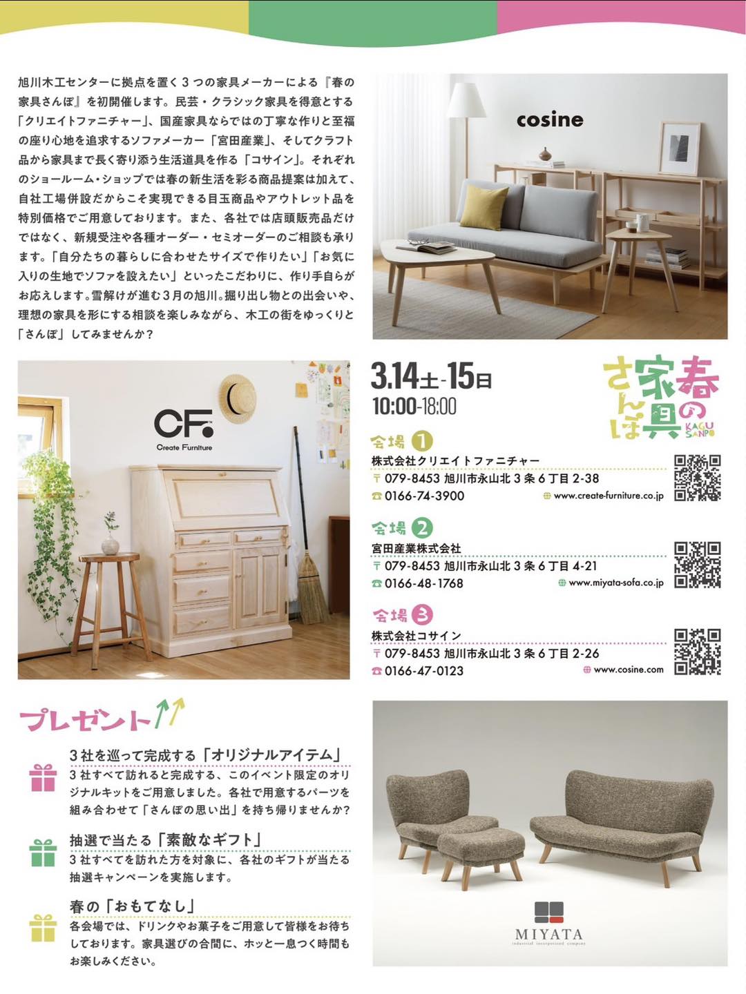 クリエイトファニチャー、宮田産業、コサインの各ショールームを巡り、春の新作提案や自社工場ならではの特別価格品をご覧いただけます。
