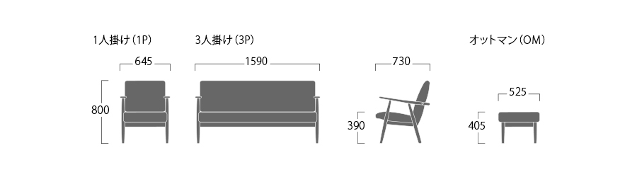 北欧のレトロモダンが語る、造形美。 JETHRO1P / 2P / OT ジェスロ 無垢材の質感が良い味わいを 感じさせるシンプルソファ。 1P W645×D730×H800×SH390 3P W1590×D730×H800×SH390 OM W525×D440×H405 画像で使用している生地は、 プロファイロ 22 となっております。(画像の生地は廃盤となりました) ※生地は予告なく廃盤となる場合がございます。